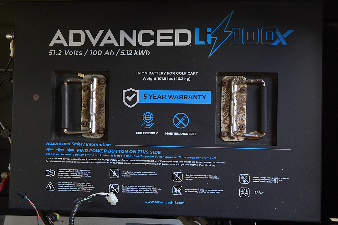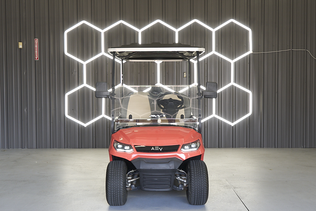 The 2023 Advanced EV Advent 6L is a lithium-ion powered, six-passenger golf cart with a 48V/440A AC controller and a 5kW AC motor. It has a top speed of 19 miles per hour and a 6-inch lift with all-terrain tires and a brush guard.