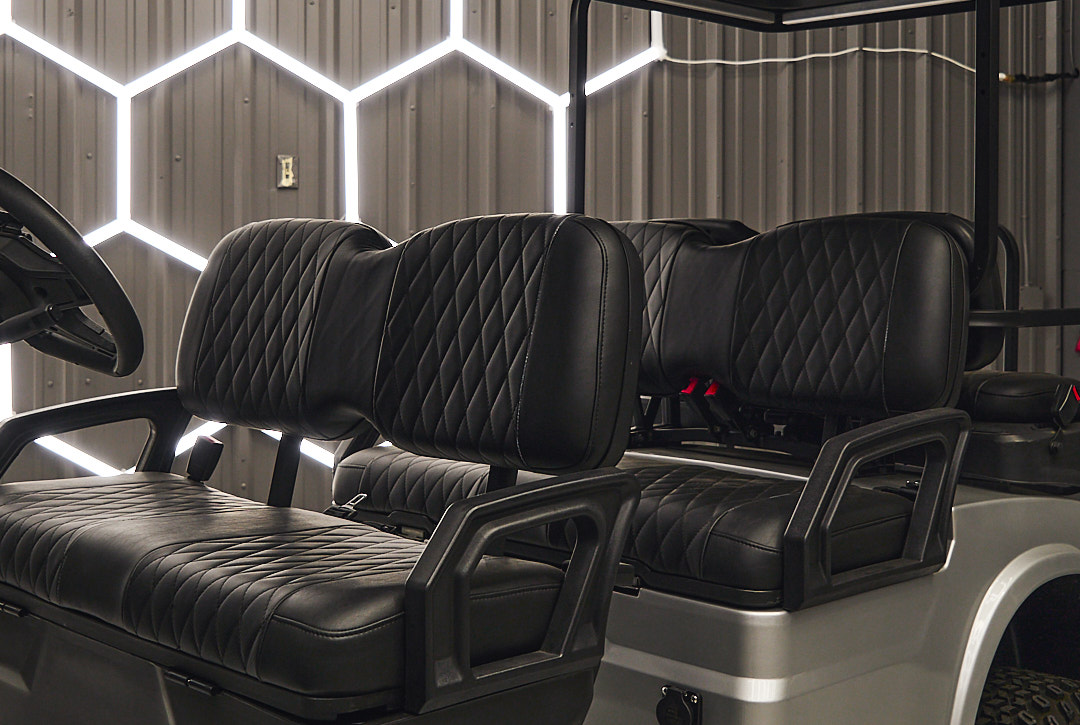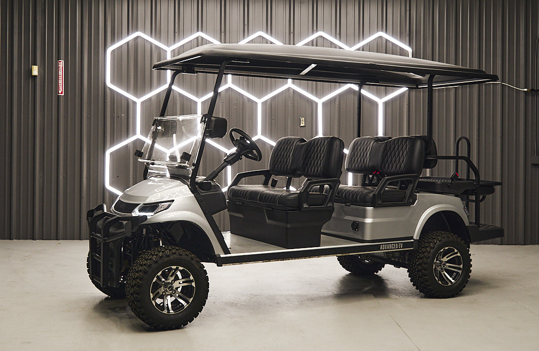 The 2026 Lithium Advanced EV Lifted Advent 6L is a six-passenger golf cart with an ECO105AH lithium battery, approximately 25 mph top speed, and 4-wheel hydraulic disc brakes. It has a long top and windshield, LED lights, turn signals, side mirrors, seat belts, and dual USB charging ports.