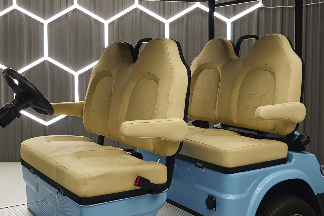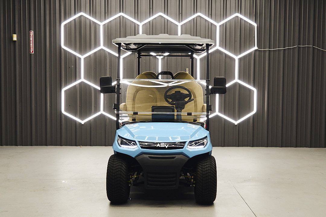 The 2025 Advanced EV Advent Horizon is Advanced EV's brand new model.  This model is not your average four seater golf cart, as it comes from the factory with a lithium battery, full support seats with adjustable arm rests, a LCD display screen with reverse camera, wet sound marine speakers, and a fitted and removable cooler in the rear.