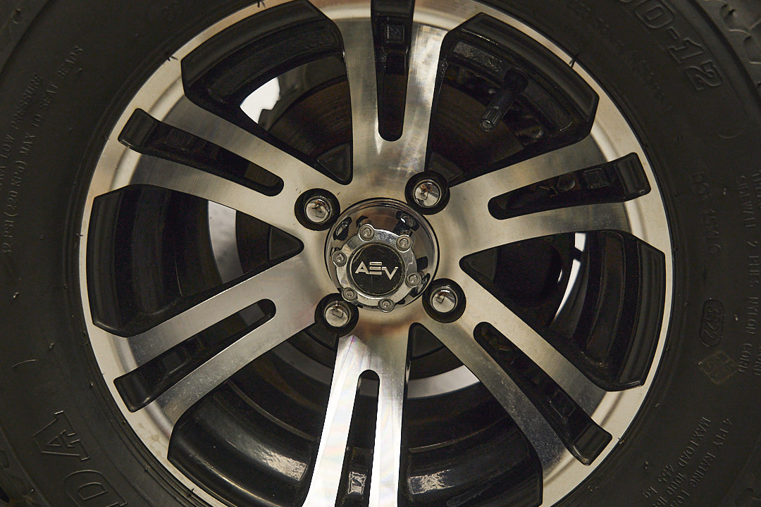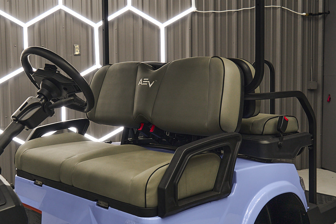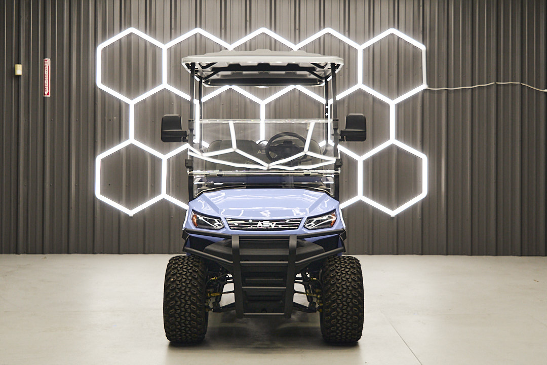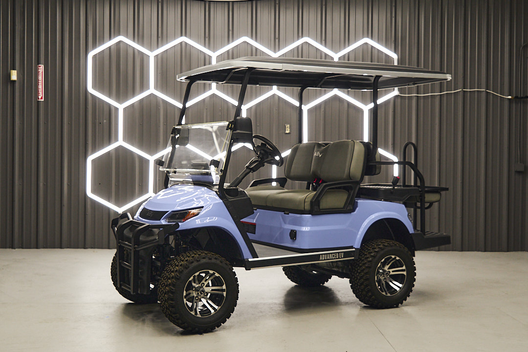 The 2026 Advanced EV Advent 4L is a lithium-ion powered, four-passenger golf cart. It has a top speed of 19 miles per hour and a 6-inch lift with all-terrain tires and a brush guard.