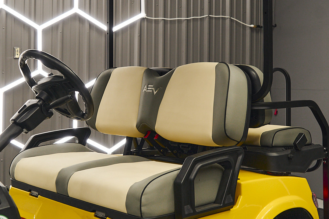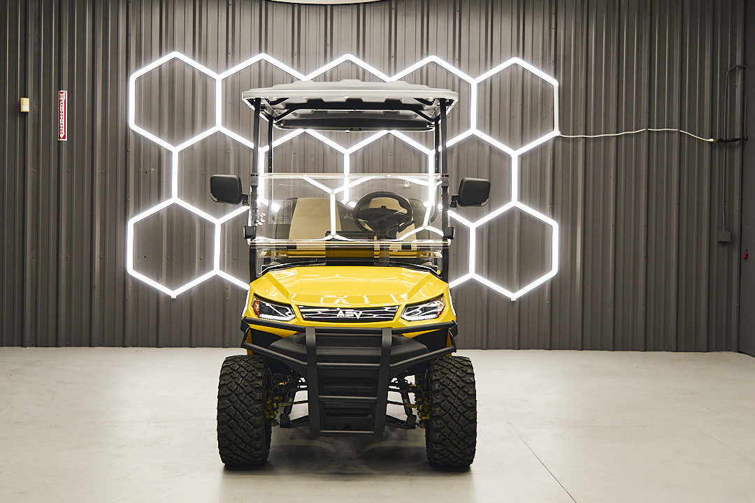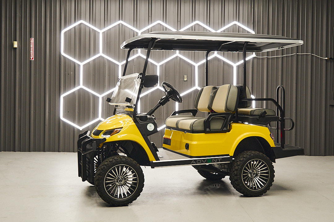 The 2026 Advanced EV Advent 4L is a lithium-ion powered, four-passenger golf cart. It has a top speed of 19 miles per hour and a 6-inch lift with all-terrain tires and a brush guard.