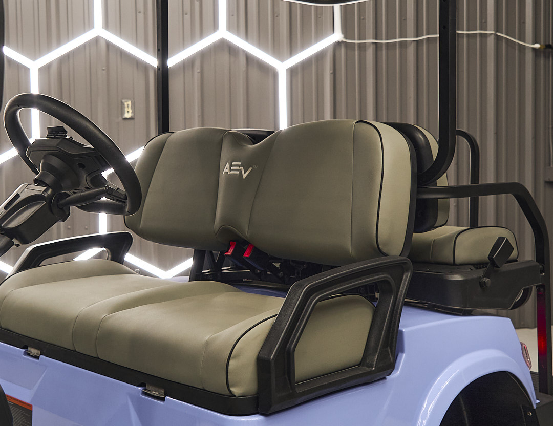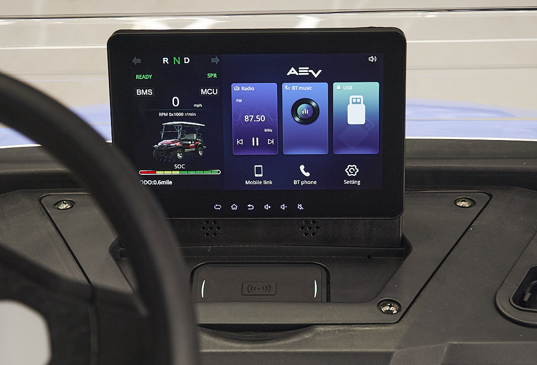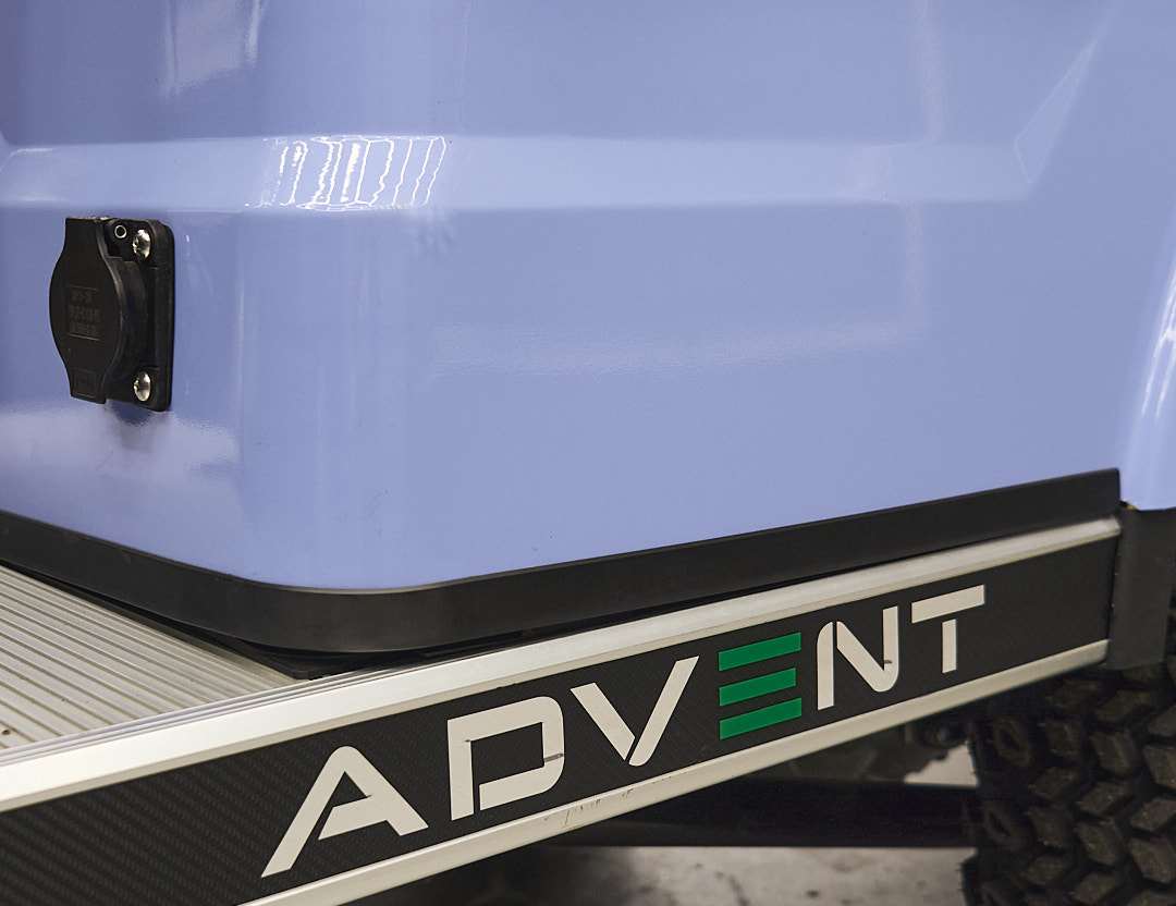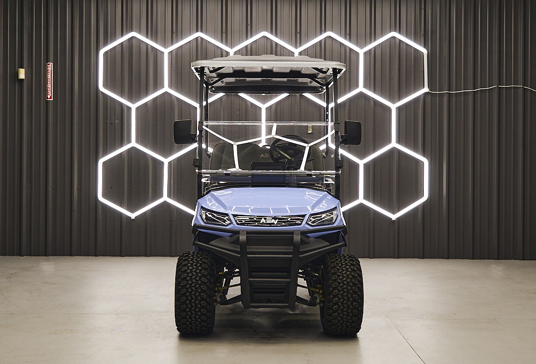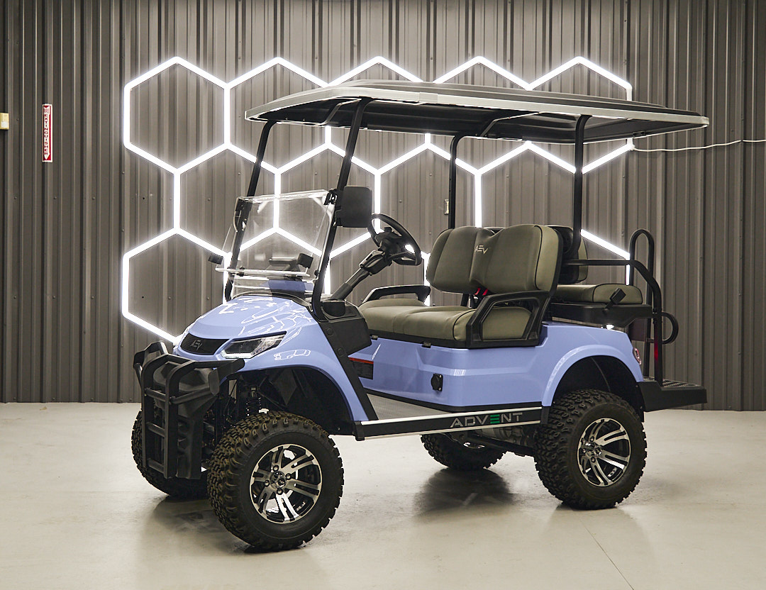 The 2026 Advanced EV Advent 4L is a lithium-ion powered, four-passenger golf cart. It has a top speed of 19 miles per hour and a 6-inch lift with all-terrain tires and a brush guard.