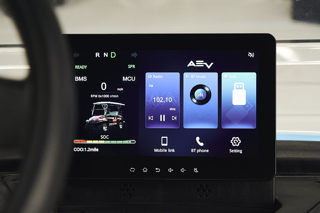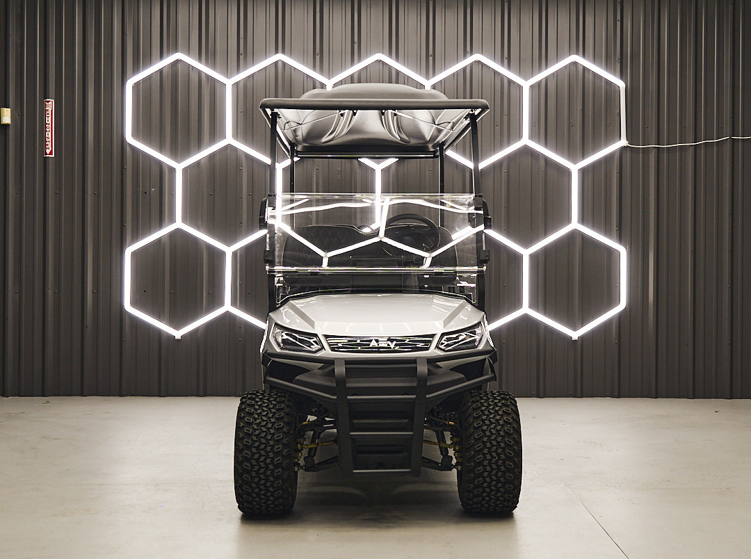 The 2026 Lithium Advanced EV Lifted Advent 6L is a six-passenger golf cart with an ECO105AH lithium battery, approximately 25 mph top speed, and 4-wheel hydraulic disc brakes. It has a long top and windshield, LED lights, turn signals, side mirrors, seat belts, and dual USB charging ports.