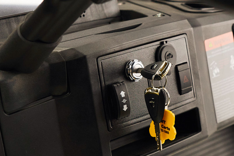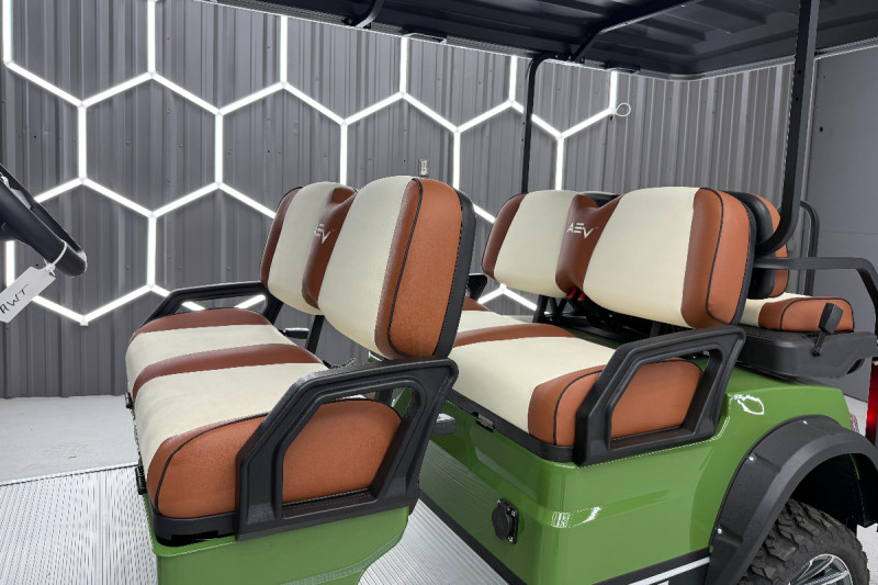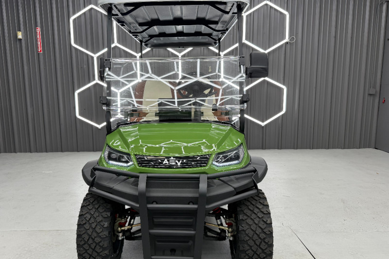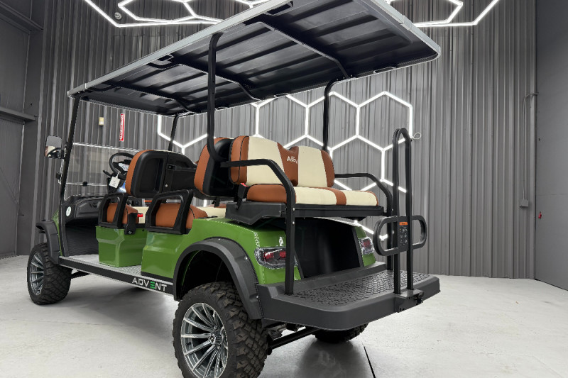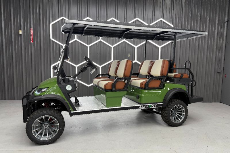 The 2026 Lithium Advanced EV Lifted Advent 6L is a six-passenger golf cart with an ECO160AH lithium battery, approximately 25 mph top speed, and 4-wheel hydraulic disc brakes. It has a long top and windshield, LED lights, turn signals, side mirrors, seat belts, and dual USB charging ports.