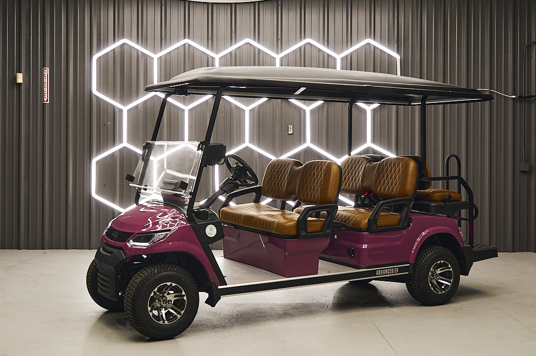 The 2026 Advanced EV Advent Click 6 is a six-passenger, street-legal, electric golf cart with a clicker braking system. It has a 2-year bumper-to-bumper warranty and comes with two unique ignition keys.